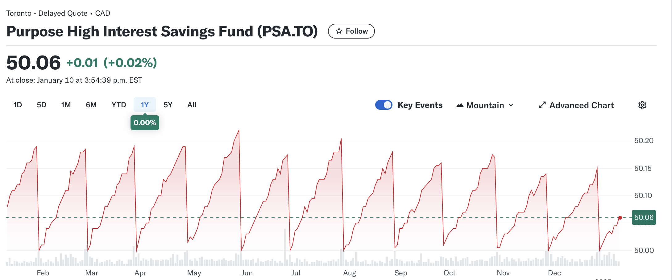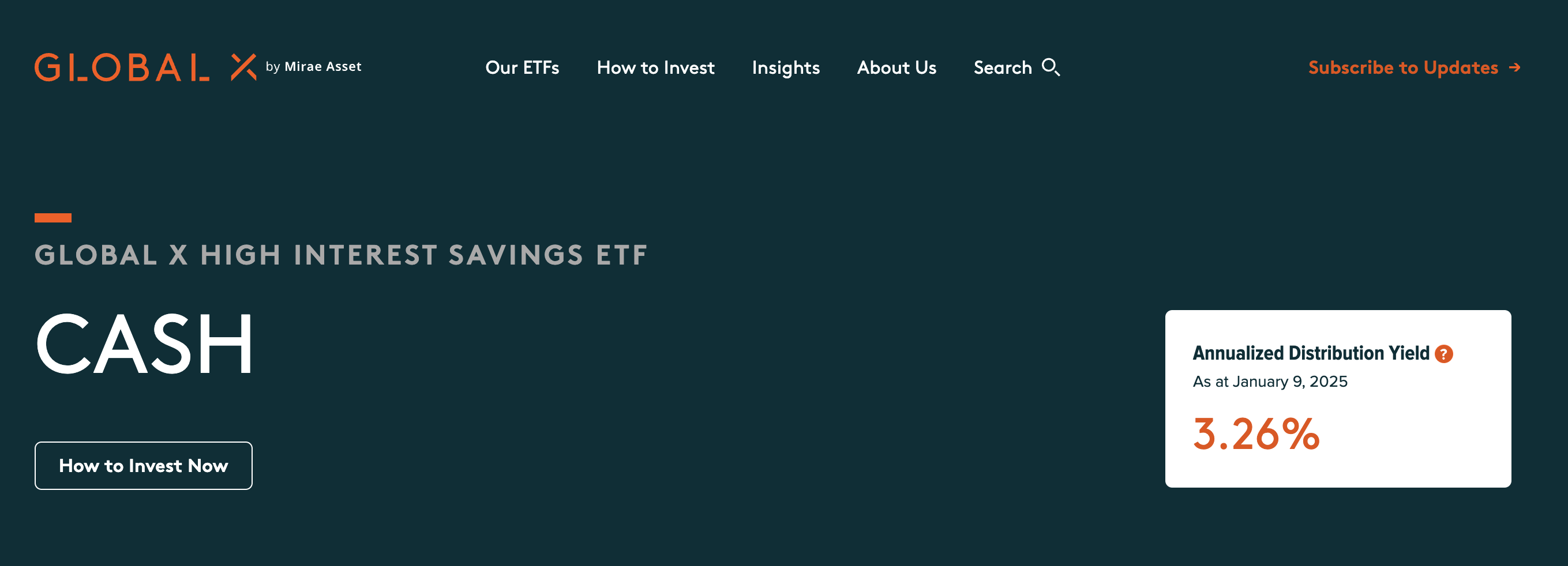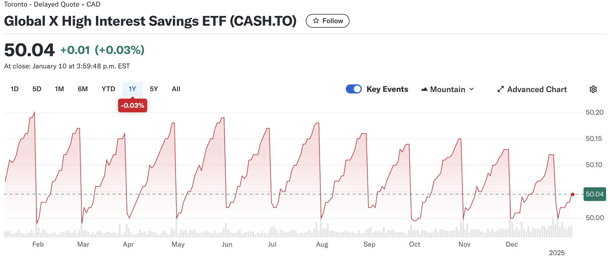 하지만 HISA나 GIC는 은행을 통해 목돈을 거치해야 하므로 주식투자를 병행하고 싶은 분들에게는 다소 아쉽거나 지루 할 수 있다. 그래서 이런 분들을 위해 HISA를 주식 종목으로 아예 파생된 ETF가 있다. 토론토 주식 마켓 (TSX)에 투자하는 분들은 CASH.TO 라는 상품이 있다. 이 상품의 특징은 오늘 ETF를 구매하면 오늘부터 주가가 매일 늘어나면서 매월 정해진 날짜 (예를 들면 매월 1일에)에 다시 $50불로 리셋이 되고 며칠 뒤에 배당락에 정해진 이율을 내가 가지고 있던 주식수만큼 이자를 배당금 형태로 지급해 준다. 예를 들어 Cash.TO가 오늘 주가가 $50.04면 하루씩 연이율을 바탕으로 매일 주가가 늘어가고 월말이 지나면 다시 주가가 $50불이 되고 배당락일에 배당금을 내가 가진 주가 * 배당금만큼 지급받는다. 이 상품의 장점은 ETF라 언제든 사고팔 수 있기 때문에 매우 유동 적라는 것이다. 주식 시장이 안 좋을 때 이 상품에 잠깐 거치해 두었다가 폭락장에 일부 매도하고 목돈을 마련하는 용도로도 좋다. 작년같이 고금리 시기에는 연이율이 5% 이상 유지되기도 했었는데 최근 금리 인하 때문에 현재 시점에서는 연 3.26% 이율을 적용해 준다고 한다.